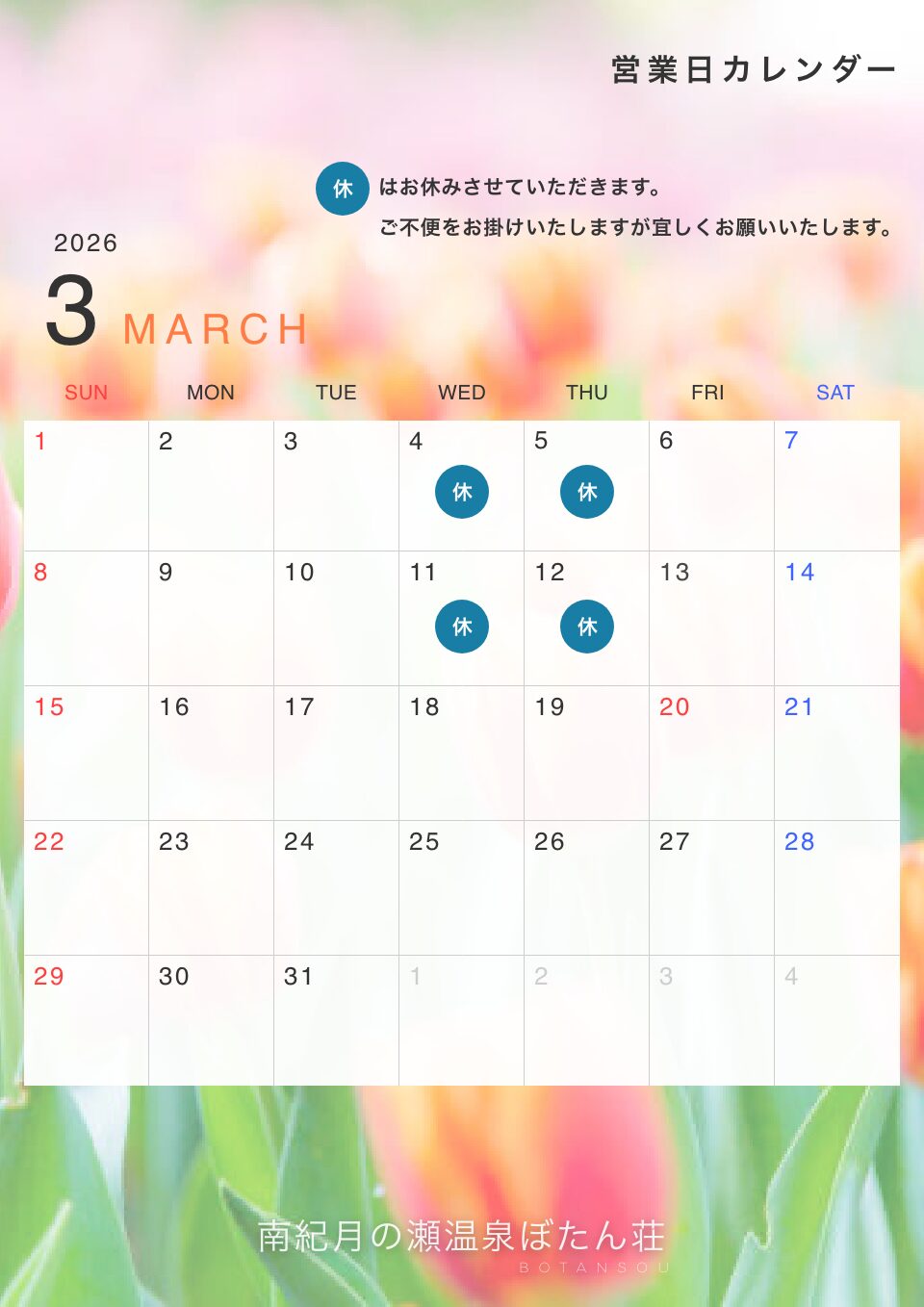 2026.01.27 3月 休館日のお知らせ 平素より「南紀月の瀬温泉ぼたん荘」をご利用いただき、誠にありがとうございます。 誠に勝手ではございますが、2026年3月の休館日を下記のとおりとさせていただきますのでお知らせいたします。 当日は大変ご不便ご迷惑をおかけいたしますが、何卒ご了承くださいますようお願い申し上げます。 宿泊予約は下記のページをご確認ください。 予約はこちら topお知らせ3月 休館日のお知らせ