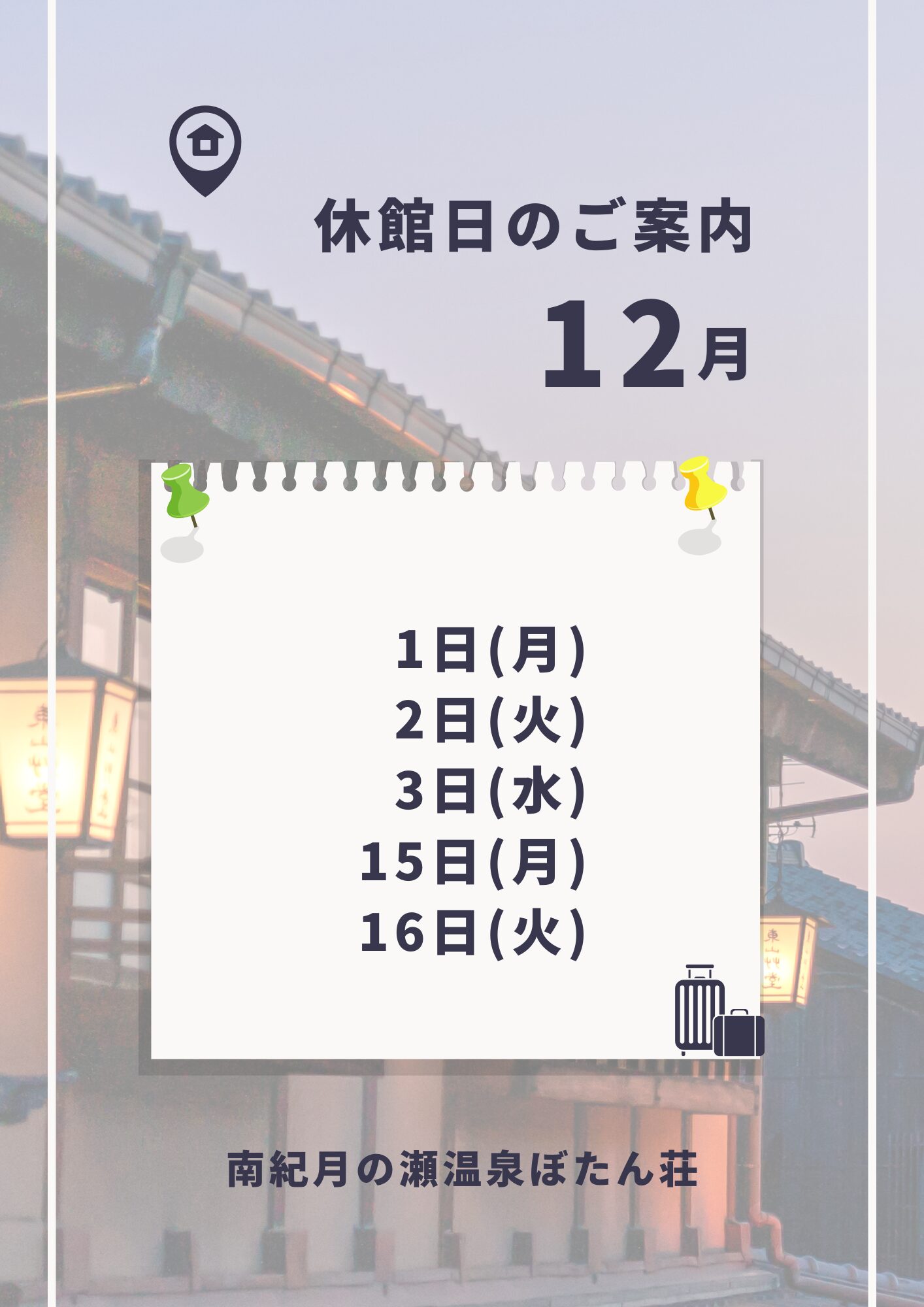 誠に勝手ではございますが、2025年12月の休館日を下記のとおりとさせていただきますのでお知らせいたします。