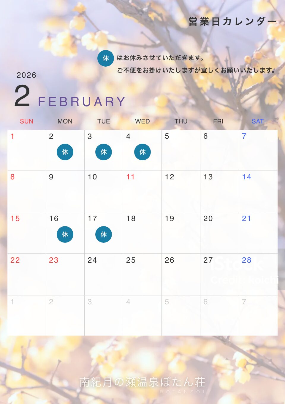2026.01.26 2月 休館日のお知らせ 平素より「南紀月の瀬温泉ぼたん荘」をご利用いただき、誠にありがとうございます。 誠に勝手ではございますが、2026年2月の休館日を下記のとおりとさせていただきますのでお知らせいたします。 当日は大変ご不便ご迷惑をおかけいたしますが、何卒ご了承くださいますようお願い申し上げます。 宿泊予約は下記のページをご確認ください。 予約はこちら topお知らせ2月 休館日のお知らせ