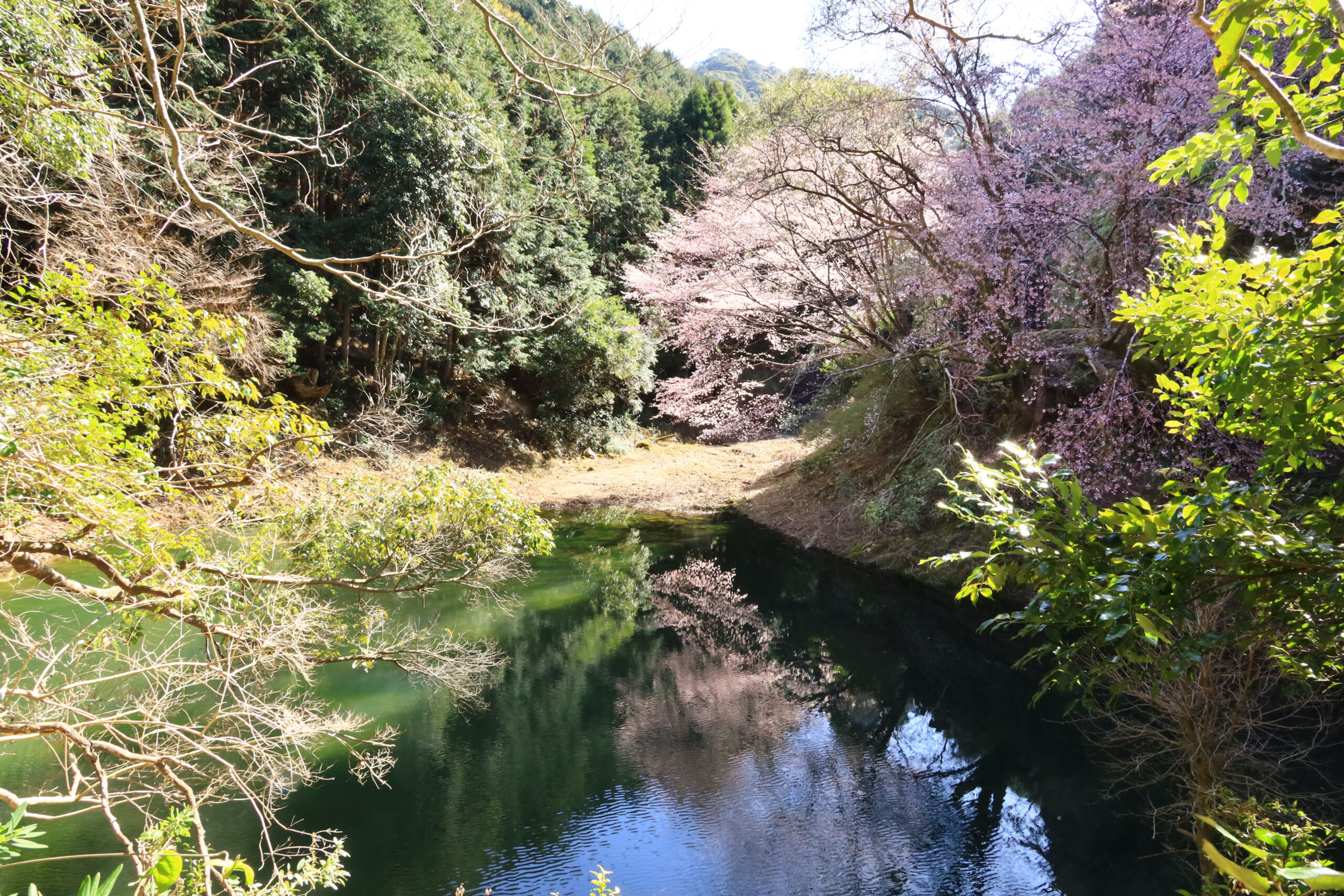 池に映るクマノザクラ(池に水があれば)が楽しめます。ここはウォークで。